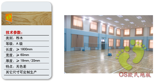 面層地板:楓木、柞木,體育運動木地板厚18mm至22mmm  寬為50mm至130mm  長度為300mm至2400mm;