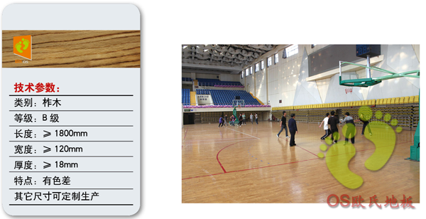 用此品種鋪裝地面,舒適、耐用。還能完全滿足運動員對體育運動、籃球、羽毛球、網球、排球、乒乓球、壁球、舞臺演出、舞蹈、健身等競技項目的訓練和比賽,體育運動木地板工程的設計在結構上除滿足體育競技和健身需求外,在選用材料上體現自然環保,在設計上還體現自然、和諧、時尚體育木地板是一種具有優良的承載性能,高吸震性能,抗變形性能的運動木地板,其表面的摩擦系數達到0.4-0.6太滑或太澀都會對運動員造成傷害。震動吸收性能達到了≥53%可有效的避免運動員受到運動損傷,而作為籃球場的體育木地板,還具有90%以上的球體反彈能力,能有效滿足運動快節奏需求。